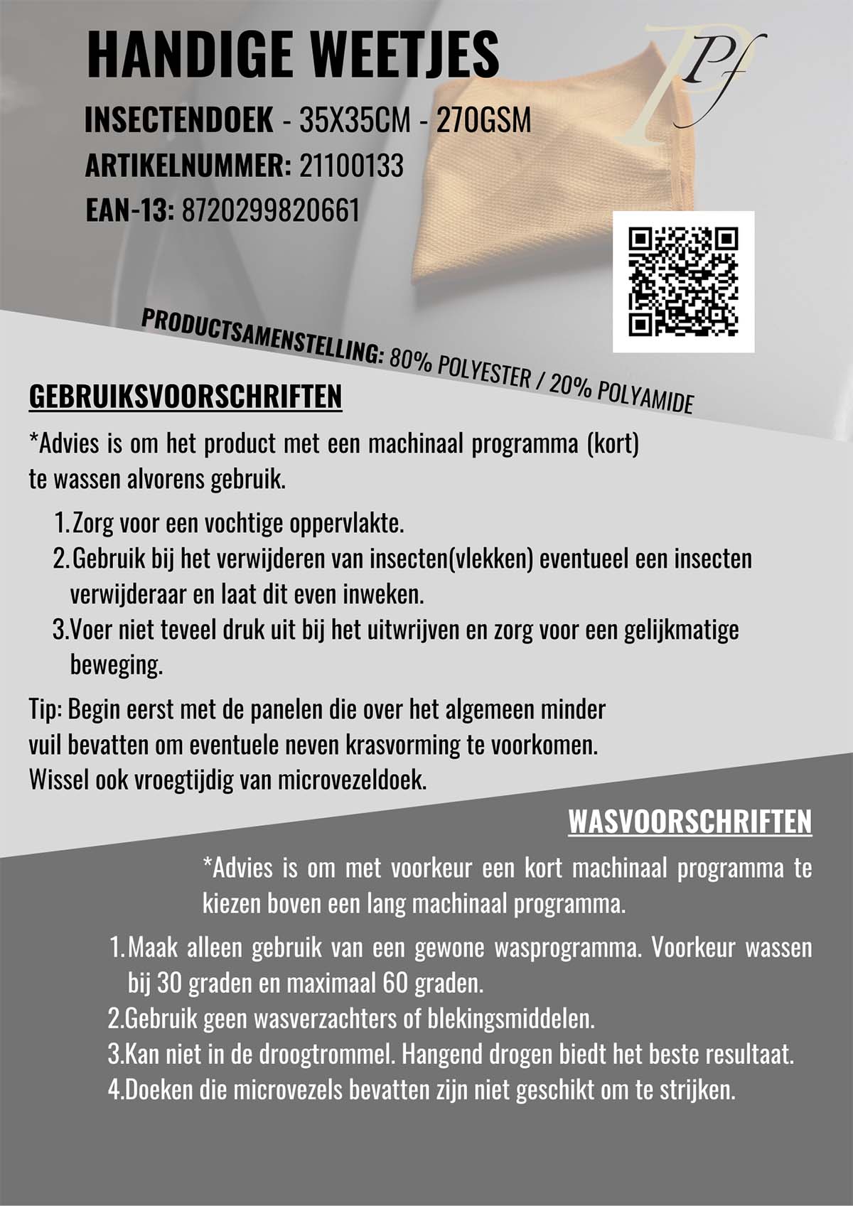 AutoCura heeft een Insectendoek – 35×35 CM van het merk Perfect Autodoeken die speciaal ontwikkeld zijn voor het optimaal reinigen van lakoppervlaktes en glas waar insectenvlekken op aanwezig zijn. Deze doeken zijn gemaakt van hoogwaardig materiaal en hebben de nieuwste technieken om het reinigen zo effectief mogelijk te maken. Door de insectenresten snel en grondig te verwijderen voorkom je dat ze het oppervlak van je auto aantasten.